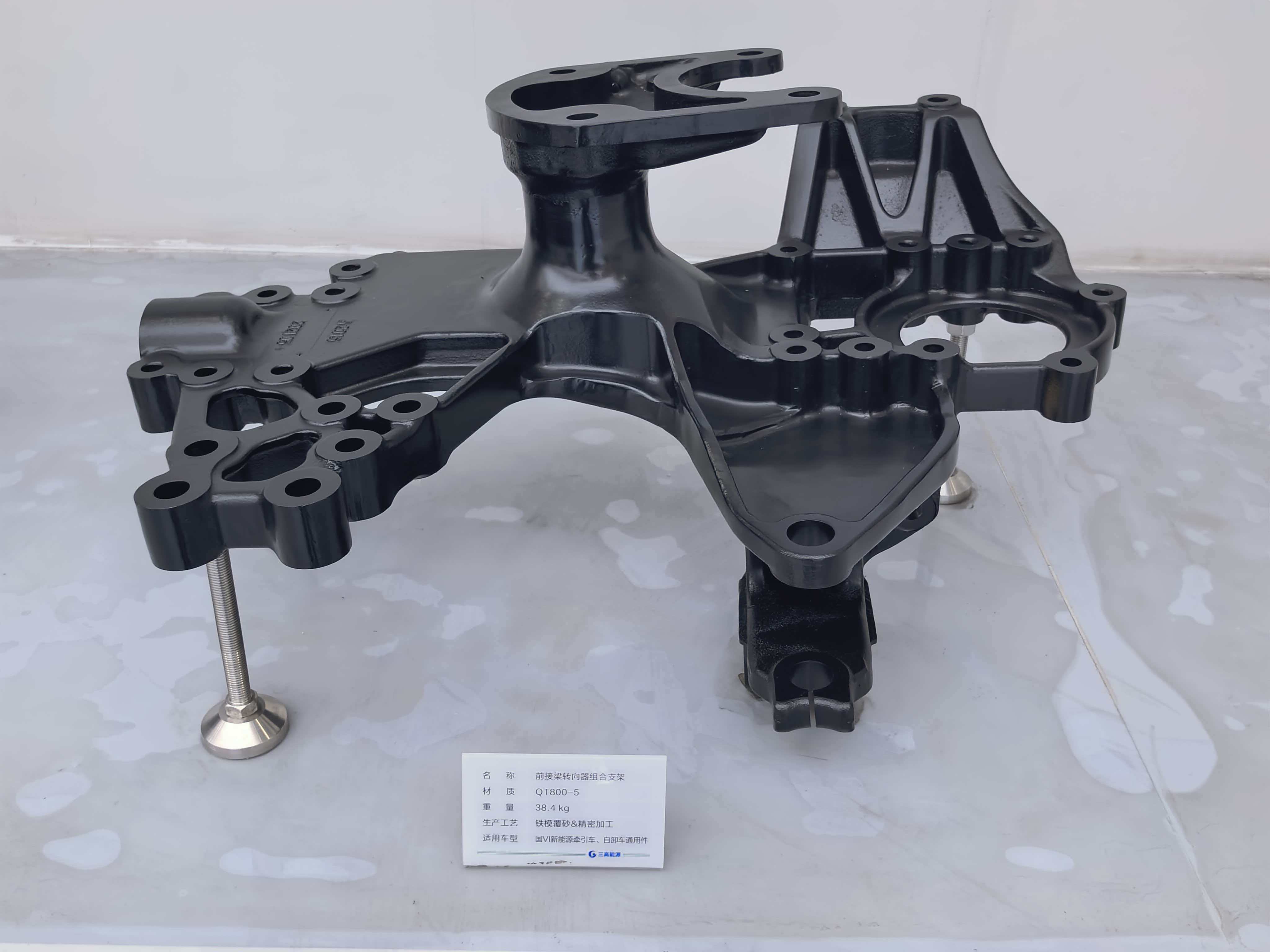 名称:前接梁转向器组合支架 材质:QT800-5 重量:38.4 kg 生产工艺:铁模覆砂&精密加工 适用车型:国VI新能源牵引车、自卸车通用件